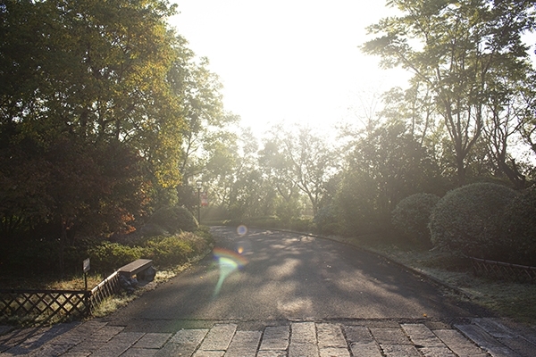 小鎮還未蘇醒,我們去迎接這份晨光,清晨的太陽冉冉升起,蔚藍色的天空分外惹眼,這份色彩是我們平日難以見到的光景。太陽是那么耀眼,你沒辦法與他對視,透過指縫,穿過林間,照耀在大地,石階小板抹上了斑駁的金色,所以你才知道,“嗯,太陽,他原來就在那里?!?